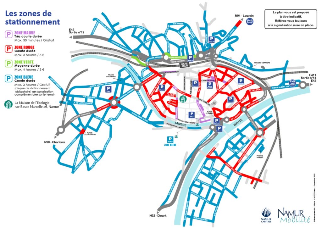 Carte de Namur reprenant les zones de parkings, les parkings en ouvrage ainsi que la localisation de la Maison de l'Écologie